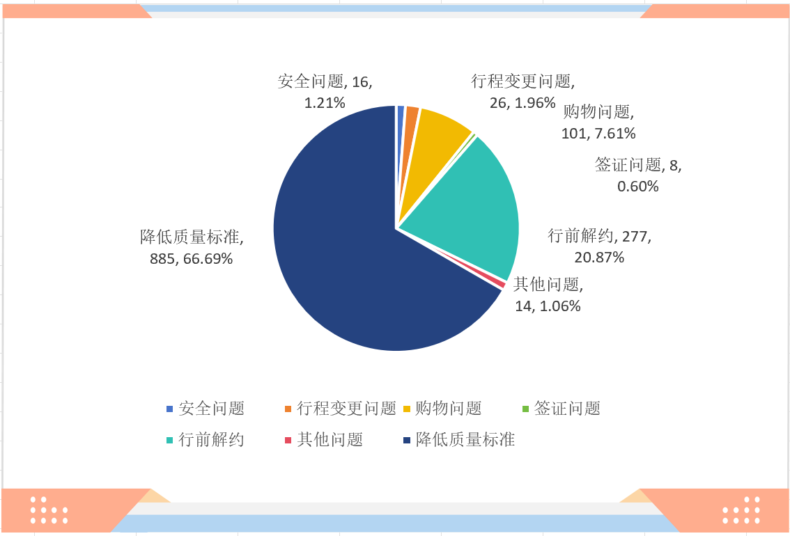 在投诉理由方面,降低质量标准885件,占比66.7%;行前解约277件,占比20.9%;购物问题101件,占比7.6%;行程变更问题26件,占比2.0%;安全问题16件,占比1.2%;签证问题8件,占比0.6%;其他问题14件,占比1.1%。